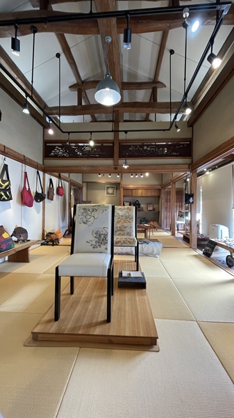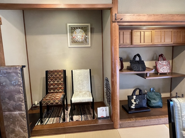 タンスに眠る帯の椅子と、 手元を彩る帯と革のバッグ 展
