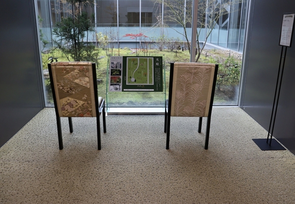 京都府立 京都学・歴彩館の中庭を鑑賞するイスとして、「四季の花文様」と「大王松文様」の帯の椅子二脚が設えられました。