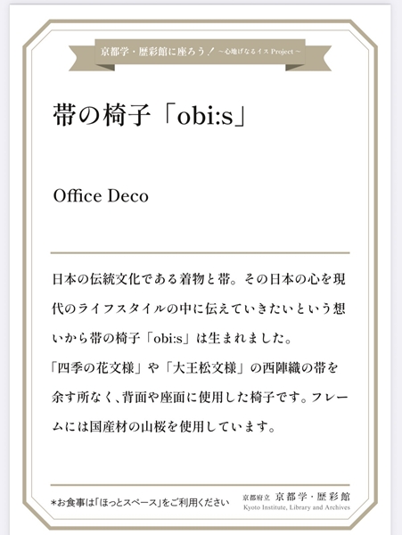 椅子の横に「帯の椅子」の説明を掲示していただきました。